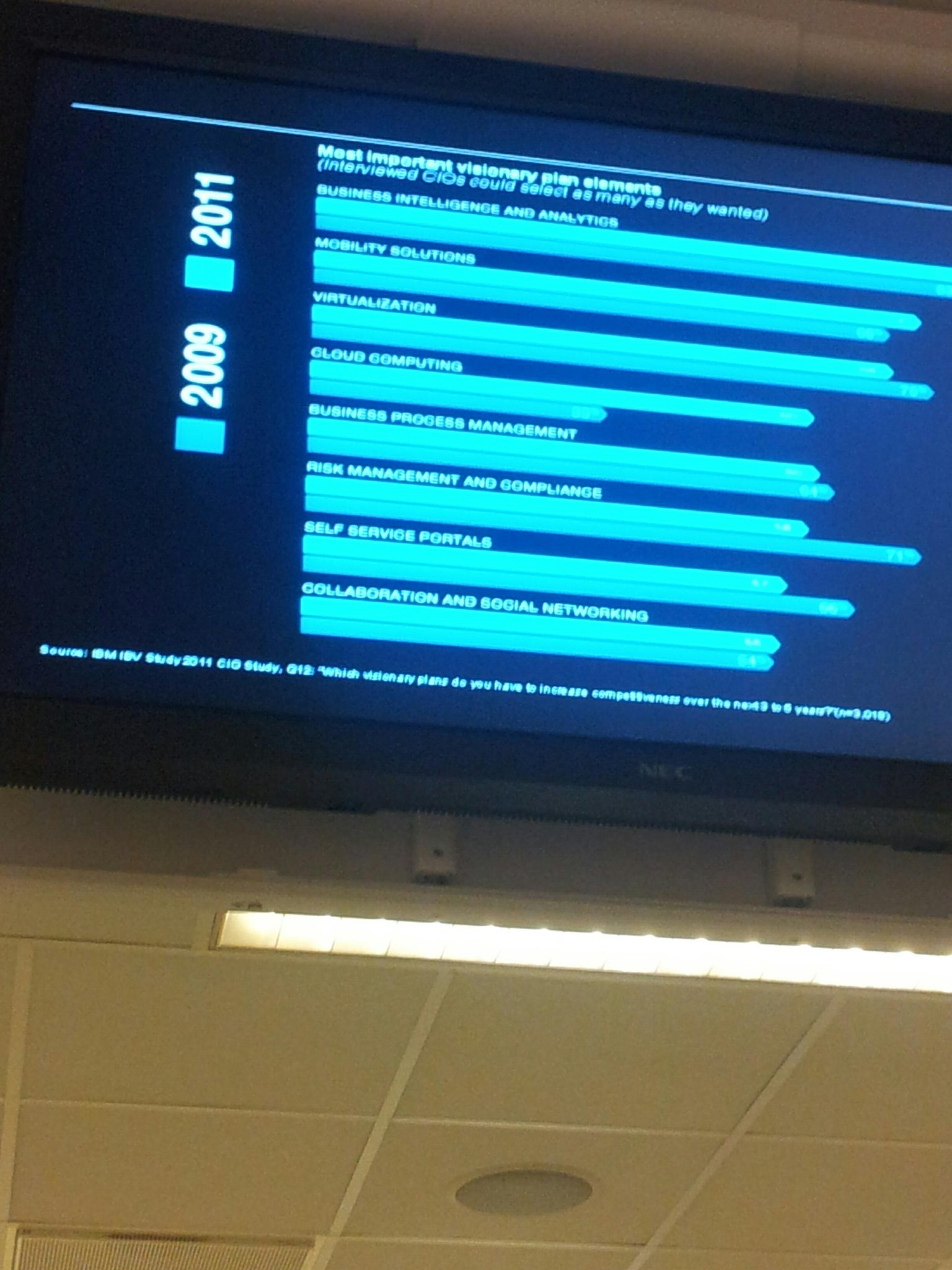 This slide showed research by IBM which displays the external forces that would impact business. Notice the tech comes first and people comes seconds. I was under the impression that CoIT (Consumerization of IT) was driven by users and not by technology.